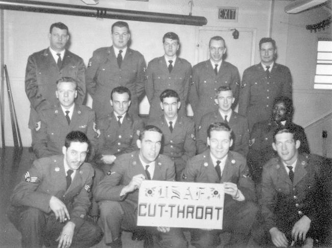 Front row (L-R) Miller (Motor Pool); Charles Mashburn (Radar Operator); Rex Cates (Radar Operator); Pursifull (Radar Maintenance). Center row (L-R) Thompson (Radar Operator); Kalous (AACS); Lewis Craig (Medic); Richard Pope (Radar Maintenance); Mack (Cook). Rear row (L-R) Captain Ken Jones (Detachment Commander); Earl Brooks (Radar Maintenance); D Coder (Radar Maintenance); Norris Peterson (Radar Operator); Fair (AACS).