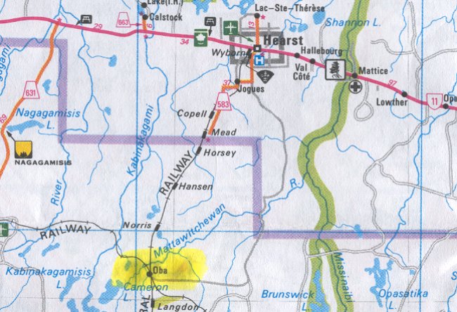 - Map showing the location of Oba south southwest of Hearst - 29 May 2002.