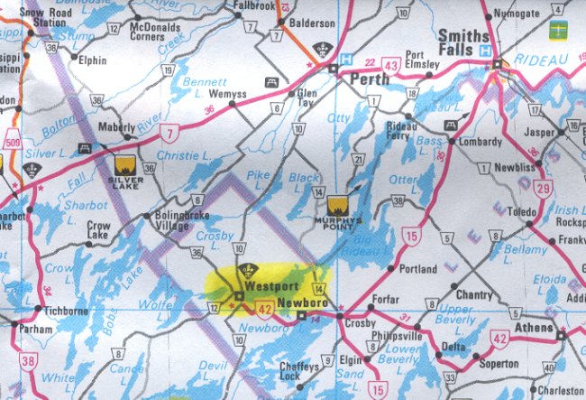 - Map showing the location of Westport southwest of Smith Falls - 29 May 2002.