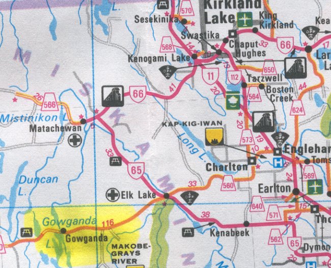 Map showing the location of Gowganda southwest of Kirkland Lake - 29 May 2002.