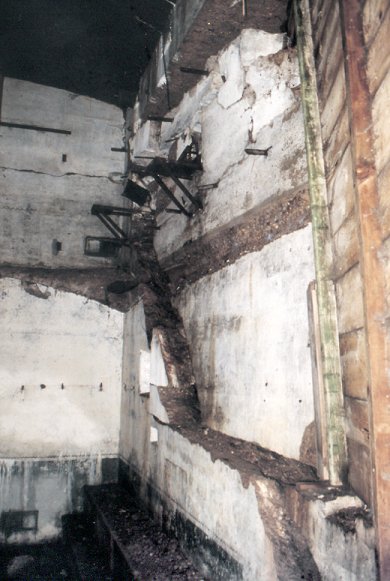 Ground level with machine gun stands and damage from 1944. The wooden wall is probably RCAF origin - 14 March 2001.