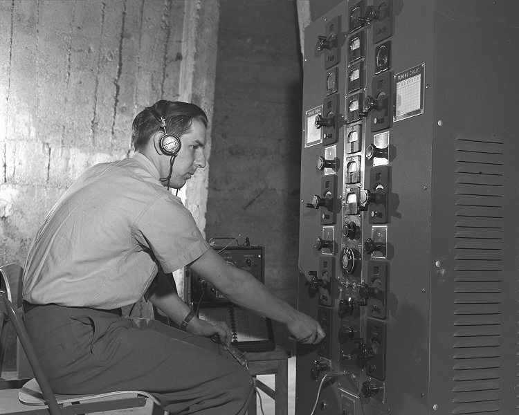 Cpl Bill Robinson working with communications equipment in the bunker - 26 June 1953.
