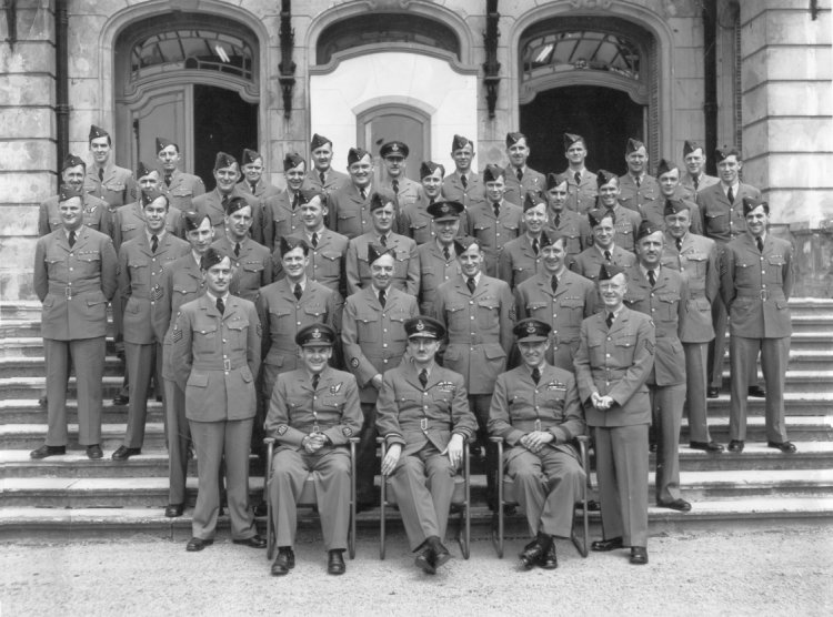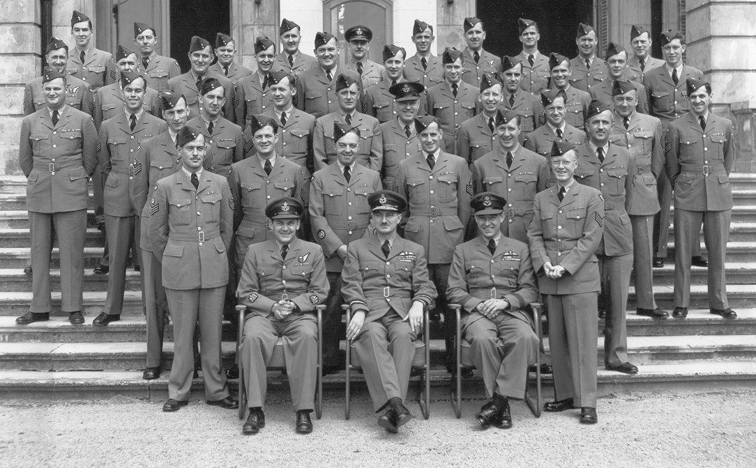 Middle row 5th from left WO2 Jim Johnstone, 7th from left WO Jack Crate. Front row (L-R) WO1 Sandy Carter, AVM Hugh Campbell, unknown officer, Sgt Douglas.