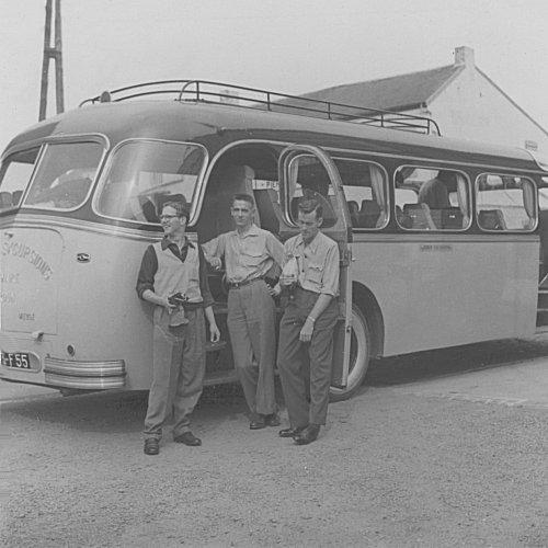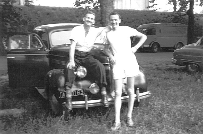 - (L-R) Skip McKimm and Reg by his car on the station - July 1954.