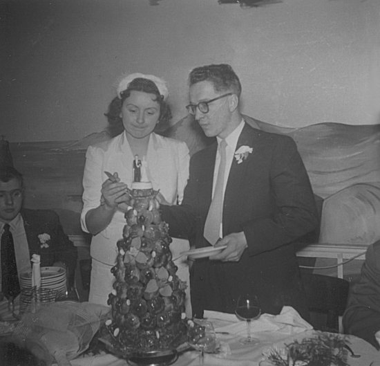 - A typical French wedding cake with rich pastry, cream and caramel to "glue" it all together - September 1954.