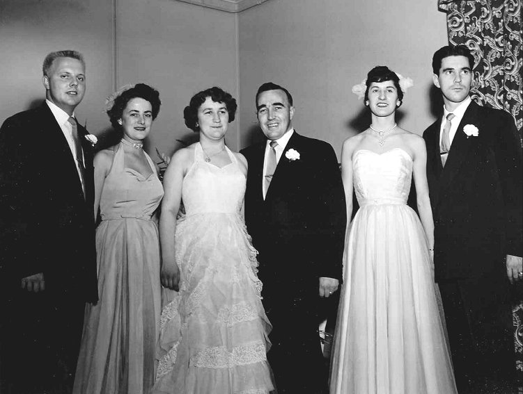 (L-R) - Lou McDonald (back to camera), "Mac" and Joy MacDougall, unidentified bridesmaid, and my future wife Terry Windich.