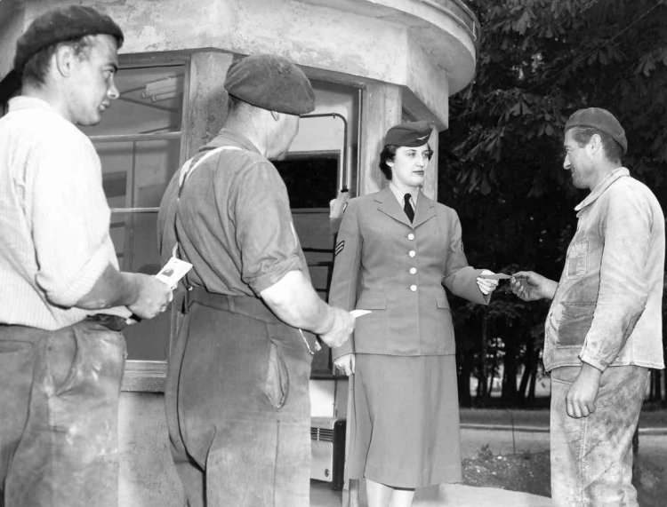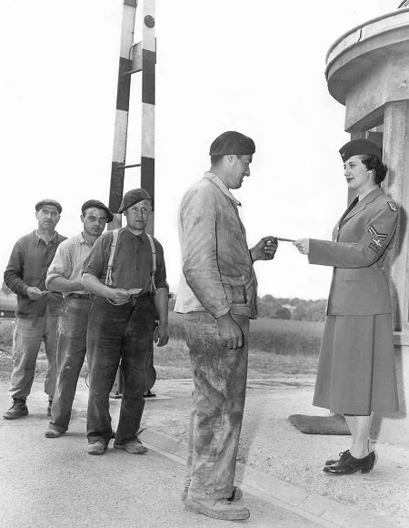 - Female Cpl (AFP) checks the ID of a group of local construction workers - August 1955.