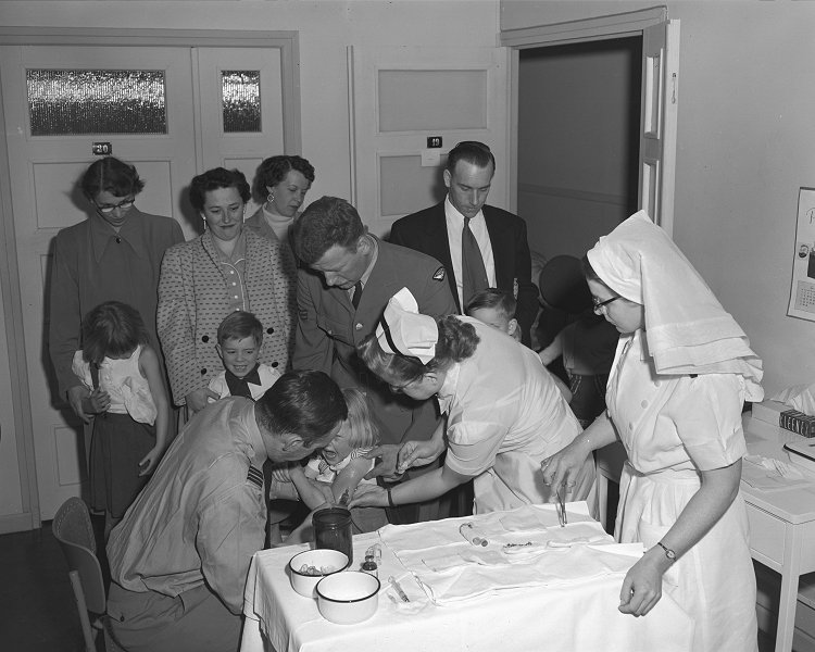 - Cpl A Lawton with his daughter getting a polio shot - 4 June 1955.