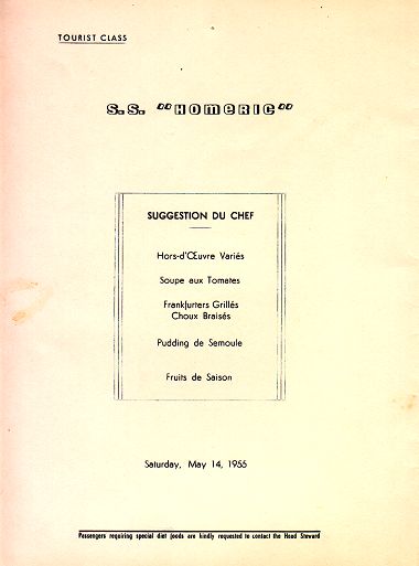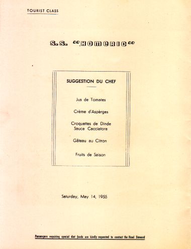 - SS Homeric Dinner Menu, page 1 of 3 - 14 May - 1955.