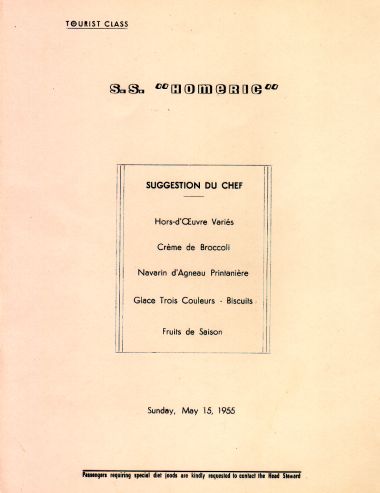 - SS Homeric Luncheon Menu, page 1 of 3 - 15 May - 1955.