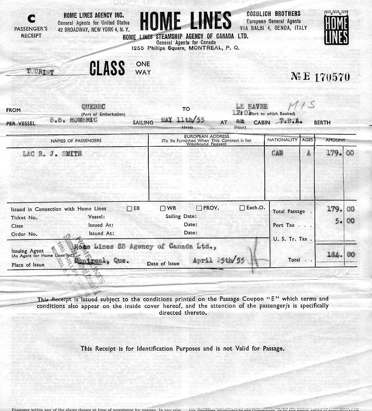 - Home Lines Passengers Receipt, SS Homeric, Quebec City to Le Havre, France - 11 May 1955.