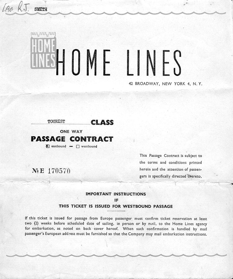- Home Lines Passage Contract, Quebec City to Le Havre, France - 11 May 1955.