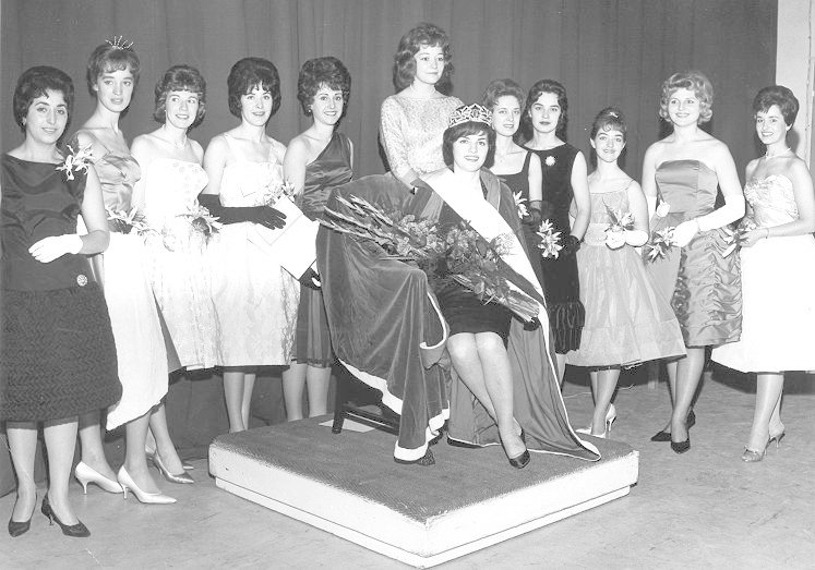 L-R Frieda Lemieux, Wilhelmina Hiscode, Jacqueline Coulson, Louise Meredith, Ann Moser, Norma Sills, Joyce Johnson, Ethel Broda, Judith Bowes, Edith Bayer and Miriam Shulman. Queen Clare Bell sitting in foreground.