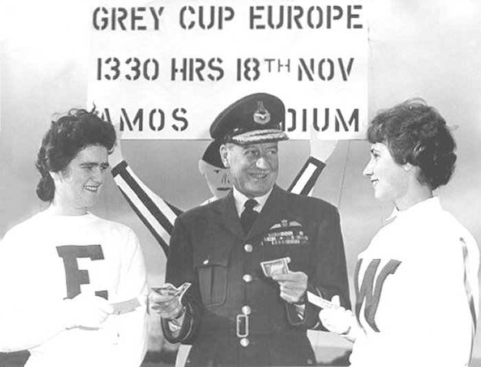 Air Commodore DAR Bradshaw, of Ottawa, the RCAF Air Division's chief staff officer, presents the Grey Cuo (Europe) to Eastern Team Captain Cpl. Dave Turnbull, of Verdun, Quebec. Miss Grey Cup (Europe) is 21 year old Clare Bell, of Egremont, Alberta.