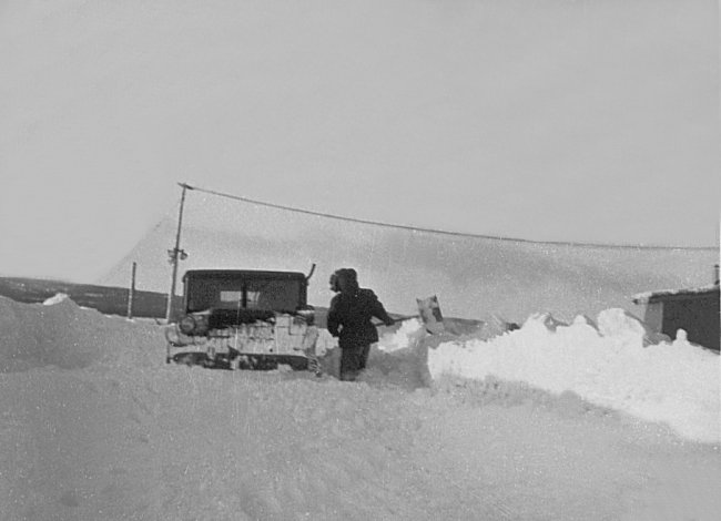 - Veronon Walker standing in front of a snow bank - February 1957.