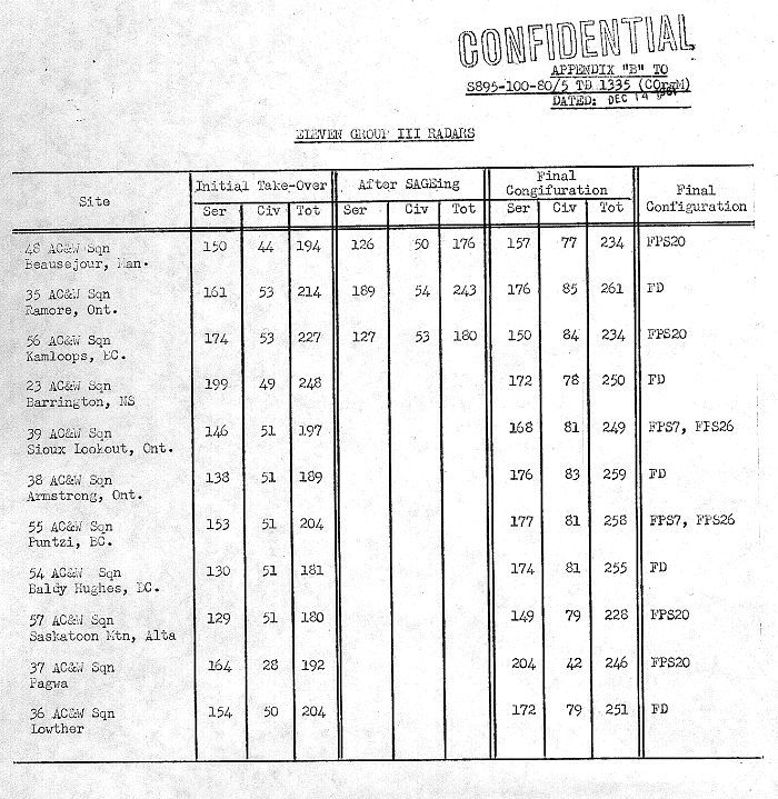- Regarding your concern about the validity of our planning establishments for the eleven Group III Radars, the attached Appendices "A" and "B" show a comparison of our Pinetree and Group III establishments. It will be noted that the latter are consistently lower, both in manual and SAGE configuration.