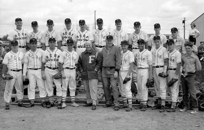 - Station Baseball Team. Back Row L-R Jack Curtis, Jack O'Reilly, Andy Anderson, Manson Sheck, Len Arseneau, Biz Crawford, Bud Atkinson, Frank Orman, Paul Duchesnes. Front Row L-R Joe Rancourt, Alex Selensak, Claude Ross, Art Clarke, W/C Geoffrey Wolfenden CO, Red Harris, Tony Dupuis, Lou Borden, Dave Mallette, Hal Harder, Bill Selensak. Lady with hand on her hip in the background was the Rec Spec - Lea Tocher- August 1958.