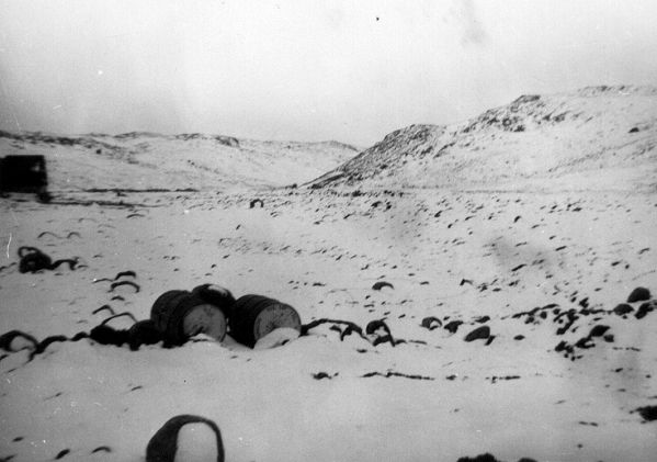 1. 45 gallon fuel barrels partially covered by snow- September 1953.