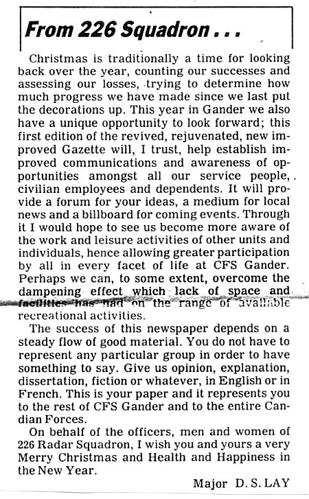 - Christmas Greeting from CO 226 Squadron. Extract from first edition of CFS Gander Gazette - December 1981.