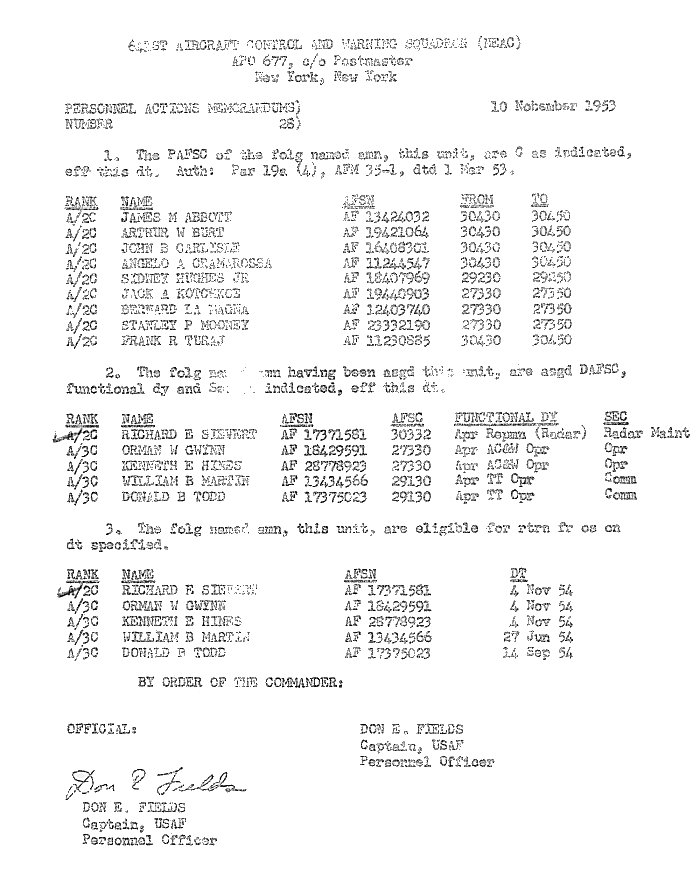 - 641st AC&W Squadron Personnel Actions Memorandum - 10 November 1953.