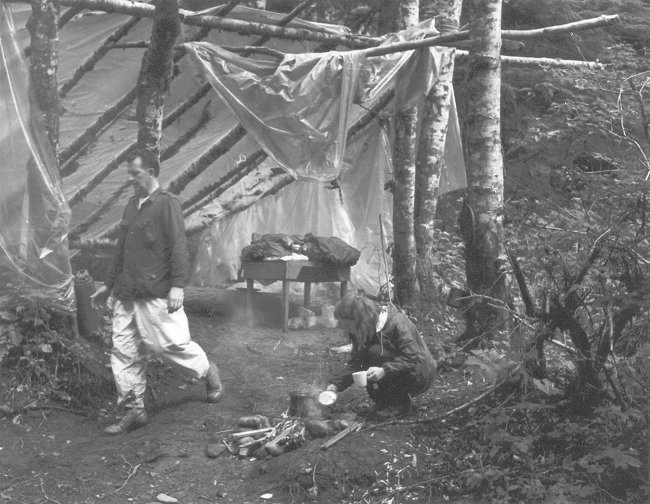 - (L-R) Don MacDonald (who captained the Nimpkish II) and Cecilia Usherwood (my wife) at our camp on the north bank of Fisherman River about 25 meters upstream from the log bridge - July 1972.