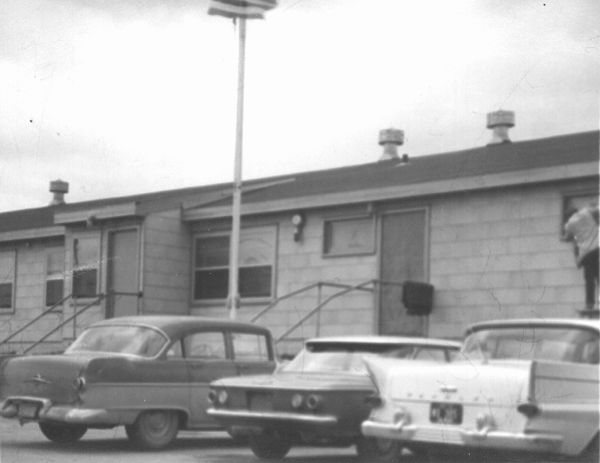 Photo of Orderly Room/Mail Room/Infirmary. Unknown person to right has head in window - September 1960.