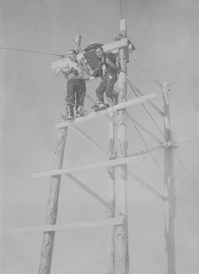 - (L-R) Len Arseneau and unknown on the ski tow - March 1957.