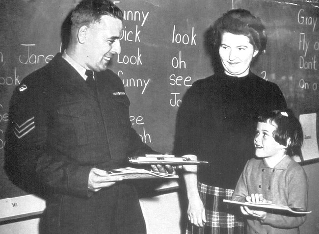 - Suzanne Little receiving a prize for a Fire Prevention poster from Sgt. Laviolette, the Fire Chief - October 1960.