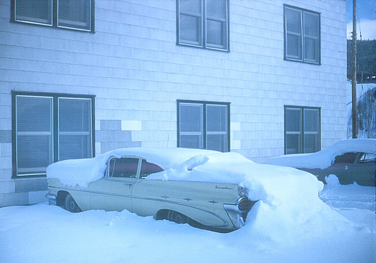 Cars covered with snow in the Airmen's parking lot - December 1965.
