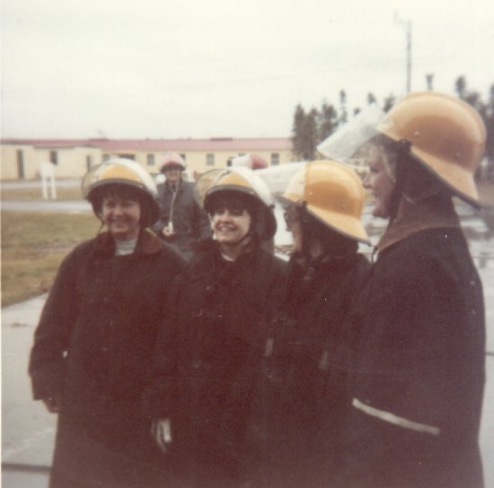 Fire Prevention Week. (L-R) Unknown, Bonnie Haines, unknown, Bonnie Lecompte - March 1975.