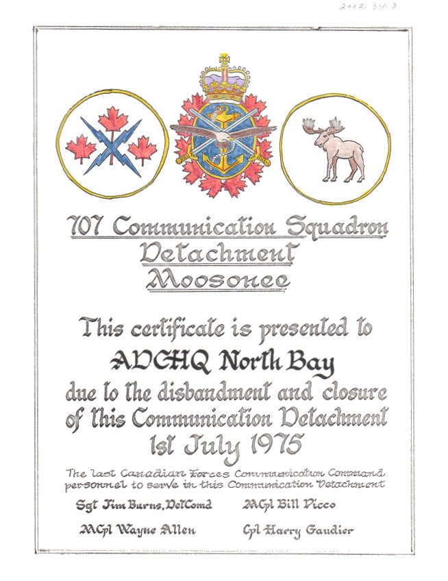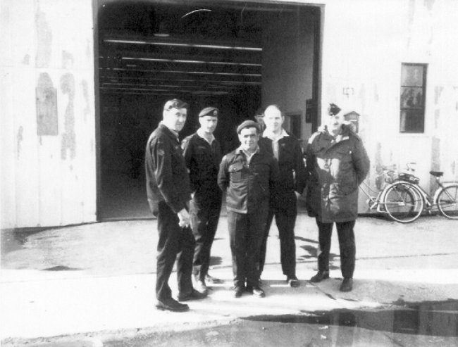 Announcement of station closure. (L-R) Mike Cassidy, Red Haines, RAF Exchange Officer, Bernie Lemieux - 17 January 1975.