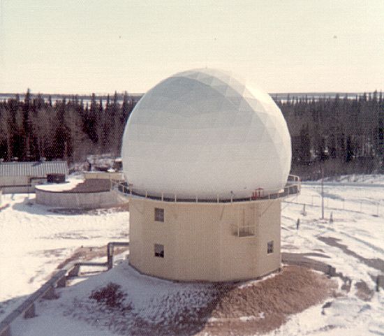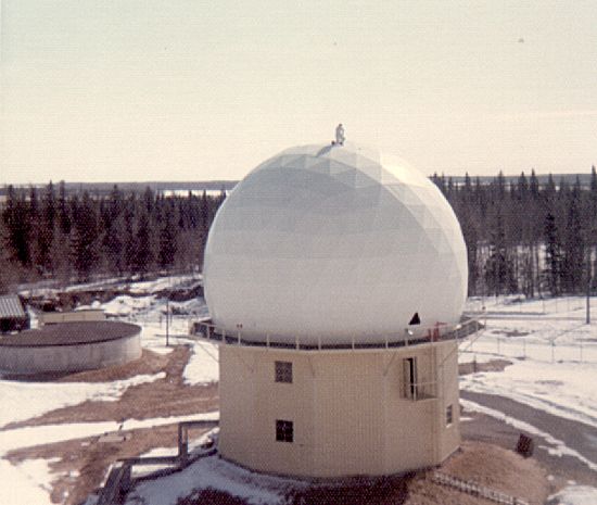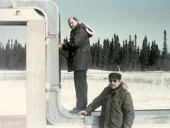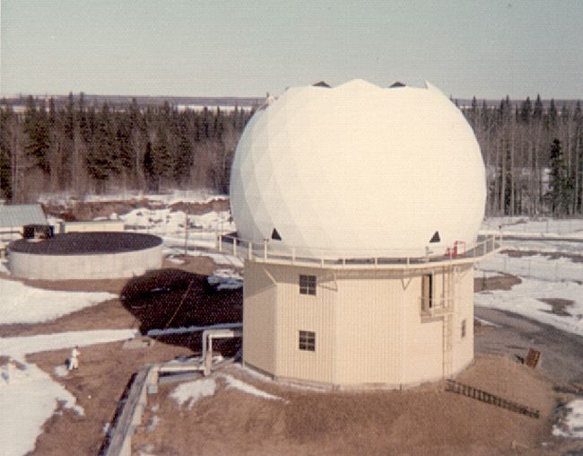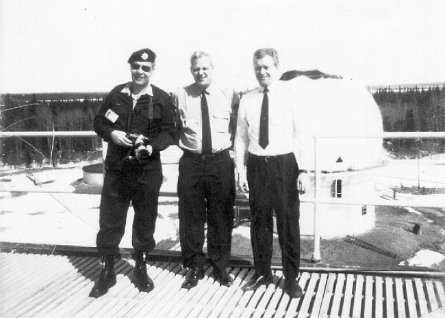 Dismatling of radomes. (L-R) John Carr, Jerry McSherry and Red Haines - April 1975.