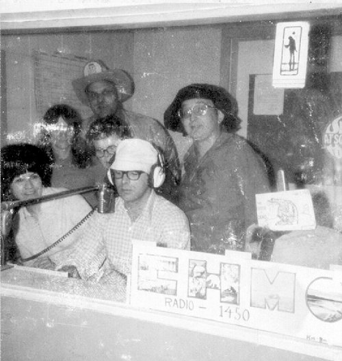 Radio Station CHMO - 1450 on your dial. Back row - Bill Sleaver. Middle row (L-R) - June Windsor, Dawn McSherry, unknoiwn. Front row - Bonnie Haines, unknown - March 1975.