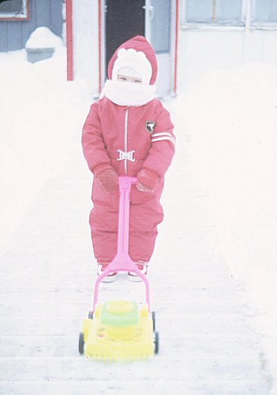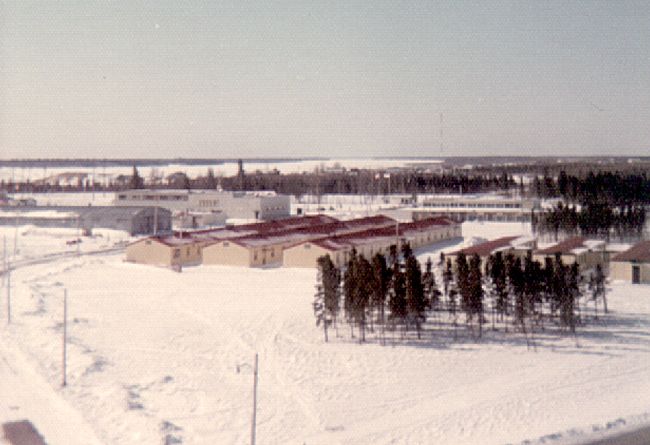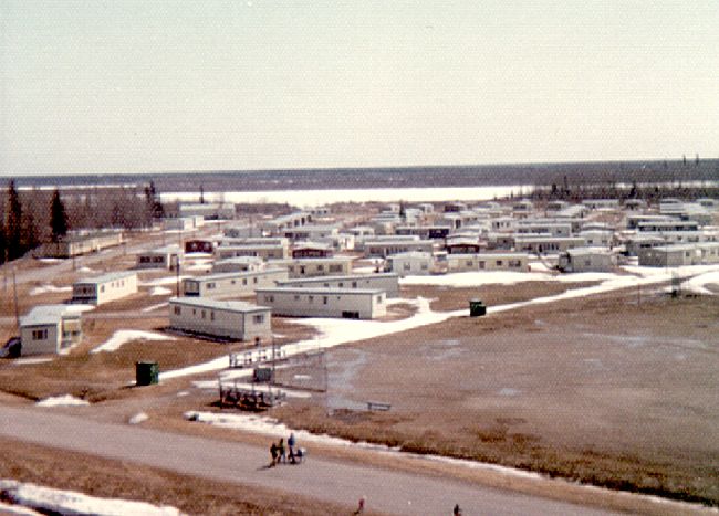 Taken from top of Ops building. PMQ's with Moose River in background. Some folks out for a spring walk in the foreground - April 1975.