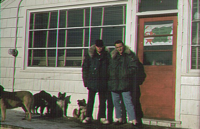 - Unidentified airmen standing in front of Hudson's Bay store with local dogs - November 1959.