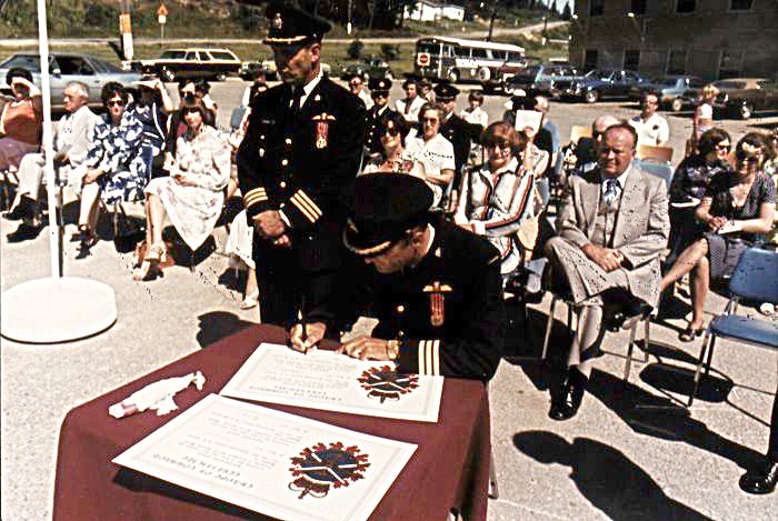 - LCol Walker signing documents to take command of CFS Baldy Hughes from LCol Dave McIntosh (standing) - July 1977.