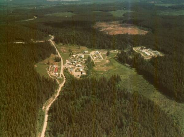 - Aerial view of domestic site. Lower trailer court. Long building in upper left is the Curling Rink. Large building in centre left is the Gymnasium.