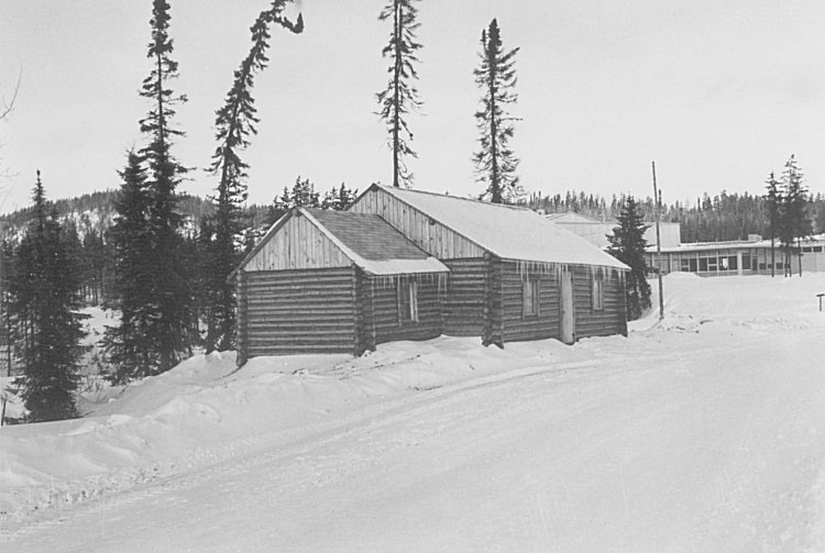 - Log cabin served as the "Church". Snack Bar in background - January 1956.