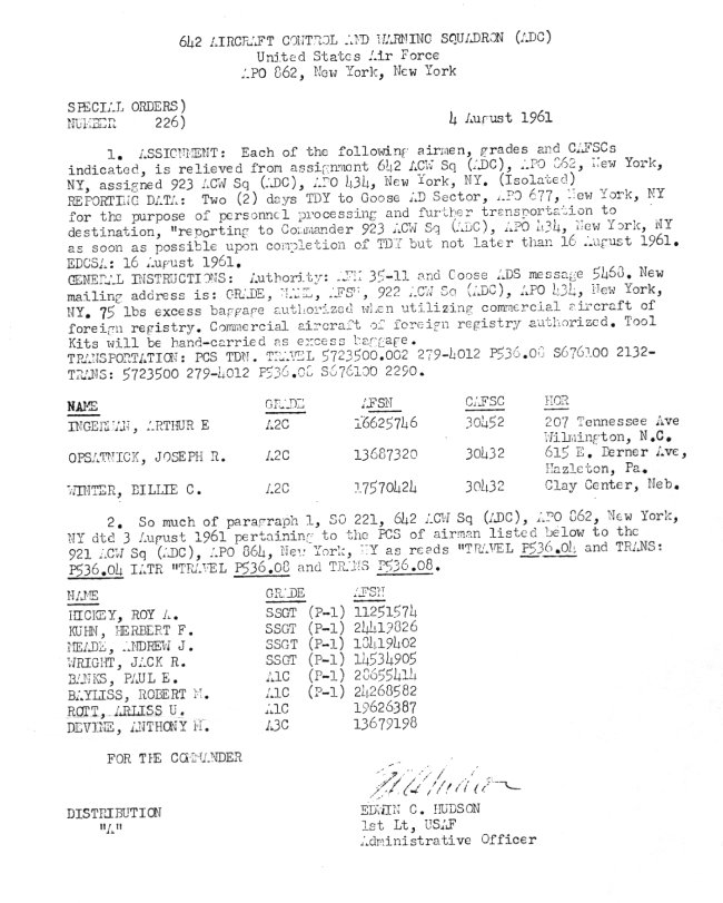 - 642 AC&W Squadron Special Orders 226 - 4 August 1961.