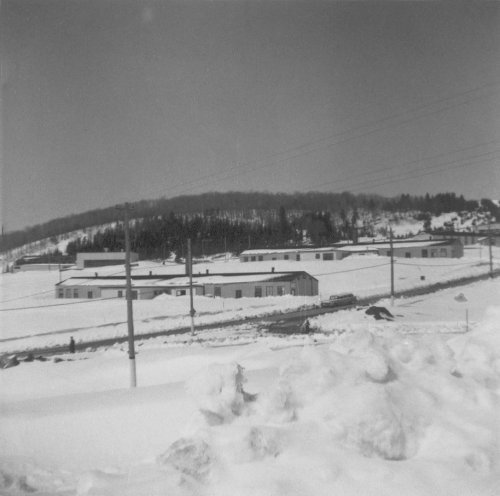 Looking from the Rec Centre. Building at left is the combined male/female barrack block - January 1961.