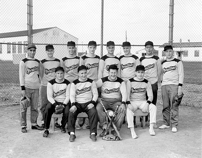 Official Operations baseball team photo. Back row (L-R) Marty Andrea, A Cummins, Roy Davenport, Al McFadden, Colin Robarts, Ted Eaid, Lorne Green, Bill Maxwell. Front row (L-R) Adam Alsasser, Fred McLeod, Tiny Matlock, unknown - September 1958.