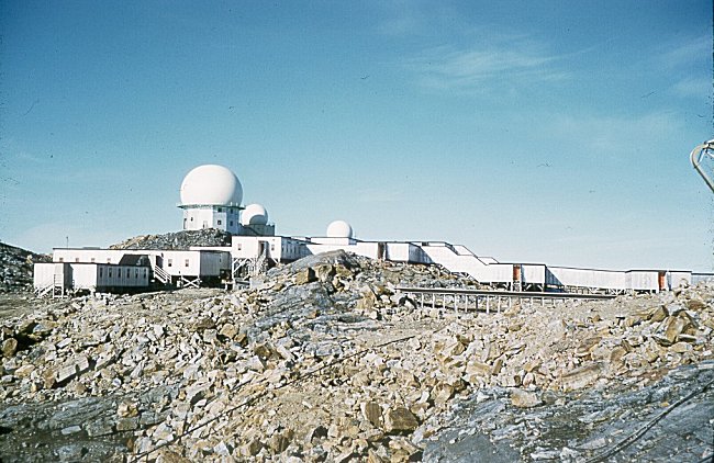 - BMEWS rearward communications and parabolic Troposcatter dish facing right (south) towards Saglek. Single Troposcatter dish facing left (north) towards Frobisher Bay. Barracks nearly covered with snow - April 1961.