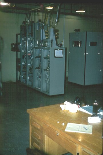 - Polevault equipment room (Building S35). Transmitters (Exciters) and Receivers for second link to Saglek. Cabinet on right is the power supply for the 10 KW Power Amplifier - August 1961.