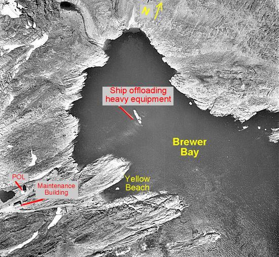 - Aerial photo of Brewer Bay, Yellow Beach, lower site POL compound, and a boat in the bay offloading equipment - 1971.