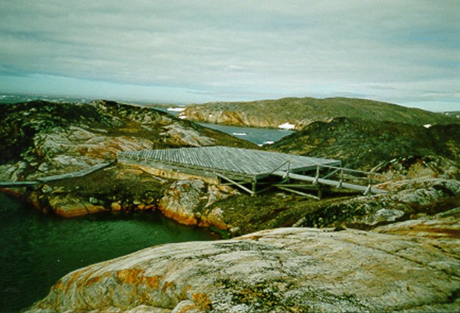 The "Port Burwell radio station, established by the Hudson Strait Expedition of 1927-1928", was considered unsuitable for future use so a site was chosen on a small island just south of Resolution Island. The station was completed in the summer of 1929 and was known as Resolution Island even though it was located on Radio Island. This station was generally open year-round as a navigational aid and weather station until October 21, 1961 when the personnel were evacuated to Frobisher Bay. The station was reestablished at Cape Warwick on the northeast corner of Resulution Island in March 1962. The following photographs were taken in August 1996 and provide some insite as to what remains on Radio Island.