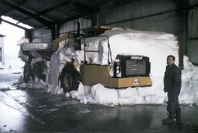 - Willard Claus assessing the amount of snow on the Cat 250E Dump Truck. There were no ends on the building at the time - 19 June 1999.