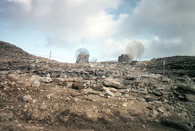 The solid "Billboard" antennas are facing Saglek. The circular mesh antennas are facing Frobisher Bay. The smaller 30 foot antenna is what the 60 foot version looks like without the outer ring of panels. These dishes collected lots of ice and were known to collapse as a result.