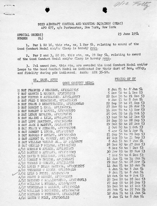 - Special Orders Number 24, page 1 of 2 - 23 June 1954.