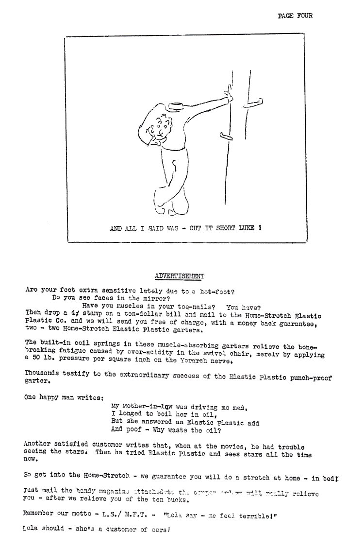 Then drop a 4c stamp on a ten-dollar bill and mail to Home-Stretch Elastic Plastic co. and we will send you free of charge, with a money back guarantee, two-two Home-Stretch Elastic Plastic Garters.