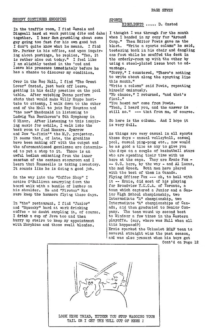 through dilated nostrils. “Is yo is or is yo ain’t in bed Inbred?” Inbred: “Ah is, Foyer, ah is for yo!” CURTAIN (applause, cheers, cat-calls, tomatoes) SCENE III (sound of screeching brakes) A Flashlight comes in for a landing on center stage. Mr. Foyer steps out moaning. Con’t adjoining page [‘Editor’ 2003. For the benefit of younger readers, L.S./M.F.T. was the old catch phrase on radio programs sponsored by Lucky Strike, and stood for Lucky Strike Means Finer Tobacco. Sometimes used here at #28 to stand for Lola Says/Me Feel Terrible.] Inbred: “You must!” Voice from the audience: “Pipe down willya, how the hell do you expect me to read my newspaper?” At this point everyone picks up their newspapers and continues breakfast. Together they amble out (sound of ambling) CURTAIN (sound of stampeding as audience rushes to get their money-back guarantees cashed) P.S. You don’t think we’re bushed eh? PERSONALITIES (CONT’D) His post war ambition is to connect himself someway with the art world. With his proven ability along the artistic lines he should realize little difficulty satisgying this desire. PAT NESBITT Born in Regina Sept. 1918, the year of the Armistice (remember?). Received all his schooling Saskatchewan’s capital city. Started earning a livelihood at Sterling Sales in Toronto. Joined the servcice in jan, ’42 and has been “in action” at #10, #8 and #28. Hobbies include ice skating and hockey, swimming, baseball and just about every sport. Chief hobby here is killing time. Has not decided, yet, what he plans to do when the rusty rifles are permanently put away. He feels that the Cape has something to offer but is of the opinion that it will take some time to discover what that something is. AL LUCAS (Mech) Born in Vancouver in 1917 and is a full -fledged, ardent British Columbian. school in that notable city for two years. Joined the Air Force in May, 1942 and has performed on both coats (#21 and #23). At times turning out a column is the easiest thing in the world, and then it is veritably a pleasure. On other occasions pouring words from a pen to paper is tougher than getting salt from one of those shakers at Alliford Bay. This is one of those latter occasions, and getting started is the toughest part of all. Perhaps a few words about my recent leave will start the ball rolling. If you’re one of those self-centred characters who don’t give a damn what I did on my leave, spend the next fraction of a minute thinking about the fiendish deeds you committed on yours - or spend the time planning future atrocities. At any rate, here is the concise report of D.M.O.’s Furlough Highlights. Beers consumed 137; ounces of liquor absorbed 182; shows seen, 3; games bowled 60; women --- sorry, this is a clean sheet. (and speaking of clean sheets, have you changed yours recently? Or are you like the Joe who was here 2-1/2 months before ye asked whereinhell you changed your bed linen?) The old camp changed a bit during the two months I was away. Faces new to the camp (but, unfortunately, not to me) were MacRae and McCrindle - two of the original Cape Scott gang of hoodlums; Pat Nisbett, from Sea Island; Bob Law, George “Farm Leave” Luxton, and Ben Guest, also from #8. By the time this reaches print the above mentioned excuses for airmen will be old timers, but I had to put their names in this column so I would have at least half a dozen readers. Another big change I noticed was the size of those pups. I bet Blackie would be proud of them if he were still here. And while on the subject of canines here’s a flash to Lou “Barry” Peikoff at #26. “Bill Hull and Triad are going steady now and to me it looks like the real thing. Of course some of the gossips around camp claim it won’t last; but they forget that Triad and Bill have a lot in common. At least they are both lovers of fine music and also neither of them has had a haircut since you left.” There is a certain party on this station whom, I confess, I shall never learn to like. He was posted here while I was out on leave, probably not having the courage to approach the station while I was here. Oh, I smile at him all right whenever we chance to meet, but the smile is only the toothy variety; my eyes, if you watch them carefully, are not in the smile. In short, I have not use for this character, and I would advise Sgt. Major Bibeau, J. J. A. A. M., (he wasn’t born today) to make sure that all rifles and fire axes are accounted for. Especially the fire axes, as I would very much like to do a small amputating job on approximately seven of the most useful fingers of this individual. I suppose, dear readers (McRae, McCrindle, Nisbett, - Cont’d page 14. Law, Luxton and Guest), that so far this is all quite a muddle to you. Let me explain. It happened one night while I was enjoying a light workout on that thing that gets in your way when you enter the canteen, which I call a pool-table, for the sake of clarity. As I leaned, carefully forward, eyeing the eight ball in my calm deliberate manner which has struck terror into the hearts of many men (it doesn’t fizz on Greenberg, with whom I was playing - perhaps because he has no heart), -- I heard it. Rousselle was playing my own “Honey Suckle Rose,” and he and his cronies sneered disdainfully my way as I paused, cue in midair. It was mortifying -chiefly because he knew how to finish it off, and some of those cronies used to be my most ardent admirers. This place is not quite big enough for the two us, Rousselle, so you’d better get going. Say, wait a minute, on second thought, I’ll go. I’ve finished my course in nature study. Short Art Note: Any of you who think it’s fun to plexi-glass should have a look at Bill Elliott’s objets d’art - sorry, Miller, that’s French for works of art. Bill won’t have to worry about a post war job. The boat that brought Gavy Henderson and your scribe back from our respective leaves took quite 